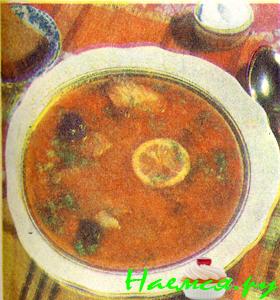 Перед подачей на стол на солянку можно положить ломтик лимона или маслины.
