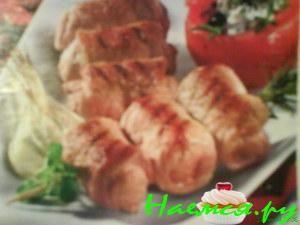 Панировать сначала в муке, затем яйце и под конец обвалять в хлебных крошках. Поджарить на сильном огне со всех сторон.