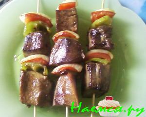 К столу подоёмвыложив на тарелку по одной шпажке мясо,курица,рыба с овощами и зеленью.