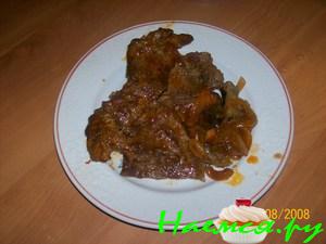 Я готовлю это блюдо как из свинины, так и из говядины (даже не знаю из чего вкуснее), сейчас свинина. Мясо режем брусочками, бекон и болгарский перчик соломкой, помидорки кружками или кубиками, кому как нравится (у меня не оказалось под рукой помидоров, я взяла банку уже порезанных), лук и чеснок, а так же зелень меленько шинкуем. В разогретой сковороде обжариваем до румянца бекон(что бы жирок растопился), перекладываем в кастрюлю, в оставшемся от бекона жирке обжариваем лук, чеснок, тоже в кастрюлю, затем до румянца поджариваем мясо, отправляем в кастрюльку и в последнюю очередь обжариваем болгарский перчик и помидорки отправляем туда же. Все продукты заливаем вином и ставим на умеренный огонь, как закипит добавляем соль,гвоздику, перчики по вкусу (красного перца примерно на кончике ножа, т.к. блюдо имеет островатый вкус) и даём повариться мин 30-35, снимаем с огня добавляем зелень и мясо по-цыгански готово!!! Подавать с рожками, рисом или картофельным пюре.