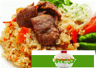 Добавить нашинкованную соломкой морковь и нарезанный тонкими кольцами лук; жарить еще 15-20 минут. Затем все залить кипятком или мясным бульоном, томить 20-25 минут на небольшом огне, засыпать набухший в воде и 3-4 раза промытый рис, приправить солью и специями. Чеснок обдать кипятком, очистить от шелухи, срезать кончик каждого зубчика и положить на рис, немного вдавив их.