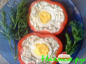 Перец вымыть, отрезать макушку и вынуть сердцевину. В натертый сыр добавить чеснок и майонез, столько, чтобы масса не была жидкой, но стала однородной. В середину каждого подготовленного перца вложить очищенное целое крутое яйцо, а вокруг - со всех сторон уложить сырную массу. Заполнить перец ею очень плотно. Затем поставить перцы на 2-3 часа в холодильник, чтобы масса лучше застыла.