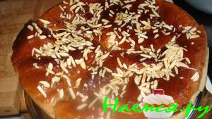 Пирог переворачиваете и смазываете глазурью, можете посыпать орехами. Поставить пирог в тёплую, но уже выключенную духовку на несколько минут.