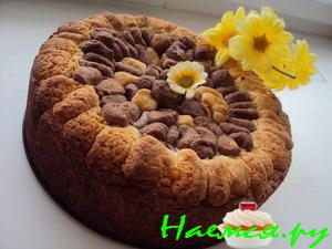 Крем: Подогреть 300 мл молока, добавить 40 г сахара, пакетик ванильного сахара, манку. Довести все до кипения, добавить 50 г сливочного масла, ввести по одному яйца. Перемешать творог с получившимся кремом. Разделить всю получившуюся массу пополам. В одну половину добавить изюм, мак и яблоки, все хорошенько вымешать.