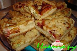 5. Тесто раскатать в пласт по величине противня. Противень смазать жиром или положить специальные листы, выложить на него тесто, сделать бортик по краям. Тесто смазать кокосовым кремом. Сливы и груши уложить в шахматном порядке квадратами со стороной 10 см. Промежутки меджу квадратами посыпать крошками. Выпекать пирог при 175 градусов по Цельсию около 40 минут.