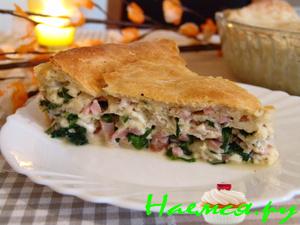 Выкладываем начинку поверх теста, разравниваем, ставим в разогретую до 180 С духовку минут на 40 или пока тесто полностью пропечется