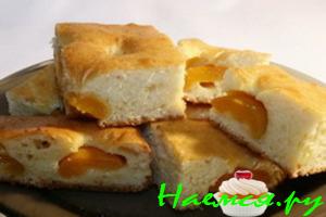 Готовый пирог вынуть из духовки, переложить на блюдо и пропитать сиропом из коньяка, сахара и воды. Сверху выложить готовую черемуху, дать немного остыть пирогу.