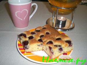 поставить на пару минут в духовку,потом вынуть и повтыкать в тесто вишню по всей поверхности.(когда так делаем - вишня не опускается на дно).