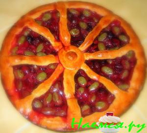 Оставшееся тесто раскатать, нарезать полосками,сделав жгутики,выложить на пирог.