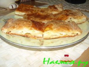 раскатать из теста два пласта, противень смазать маслом и положить на него первый пласт, затем разложить начинку, накрыть вторым пластом теста, защипнуть края, смазать желтком и отправить в духовку до готовности