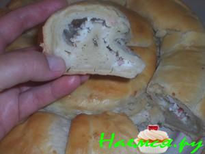 Тесто раскатать тонко наверх разложить ,по всей поверхности начинку,свернуть рулетом.Сковороду мажем маргарином,выкладываем рулет "улиткой" мажем желтком и в разогретую духовку.Выпекаем при 190-200 гр.15-20 мин.