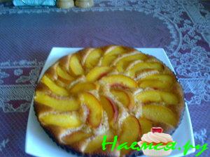 3) В форму кладем промасленную бумагу, выливаем в нее тесто и сверху теста выкладываем фрукты нарезанные на дольки или половинки.