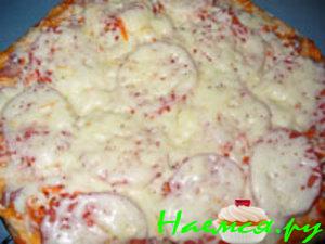 Выложить тесто на смазаный маслом противень помазать смешанным майонезом с томатной пастой.