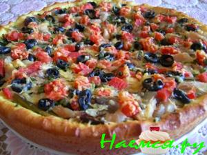 Раскотать тесто смазать томатом наверх положить тунец с луком,сверху посыпать сыром.выпекать на 200гр.до готовности мин 30.