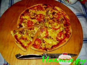 Выпекаем пиццу в середине разогретой духовки ровно 10 минут. За это время тонкое тесто пропекается, но при этом не пересушивается. Сыр тает, но не твердеет.