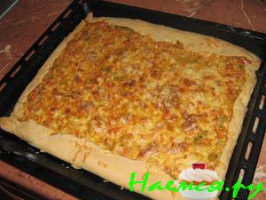 3. Если же я хочу удивить гостей, делаю такую начинку. Куриное мясо порвать (не порезать!) на небольшие кусочки и уложить на тесто, сюда же — консервированную кукурузу и порезанный кусочками консервированный ананас, тертый сыр, майонез.