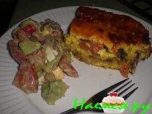 7. Вынуть из духовки и начать выкладывать слои начинки в следующем порядке: половина помидорнай начинки-аккуратно разровнять, кусояки грибов( плотно по диаметру пиццы), туна- равномерно по диаметру, остальную половину помидорной начинки,аккуратно выложить по кругу все печённые овощи, кубики феты , посыпать пармезаном, выложить маслины и кукурузу и всю "конструкцию"( как сказала моя доча - ну наконе-то, моя нудныя помощница :-)) посыпать натёртым сыром.