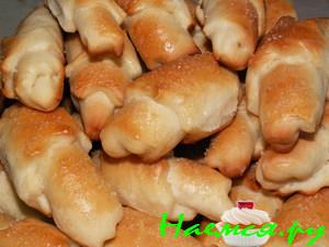Рассол смешать с маслом и с сахаром затем туда добавить муку смешаную с разрыхлителем и замесить тесто .
