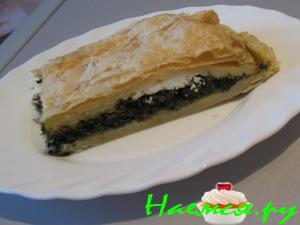 Слоёное тесто раскатать на величину формы для запекания, вложить в форму или противень, положить начинку, сверху положить другой пласт теста, защепить края. Смазать растопленным сливочным маслом и выпекать.