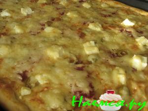 Смазываем тесто соусом, сверху начику как вам нравится, я все пиццы делала по-разному, мужу больше понравился такой вариант: помидоры, фарш, два сыра, оливки.
