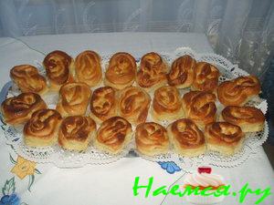Замесить тесто.И дать ему поднятся 2раза.Затем разделить на равные части примерно 12 штуккаждую часть раскатать смазать маслом посыпать сахором с корицей свернуть трубочкой ,трубочку ещё раз свернуть попалам и по центру разрезать и вывернуть .Булочки смазать желтком дать им постаяать 15мин.затем выпекать.Если кто-то не любит корицу можно заменить ванилином.