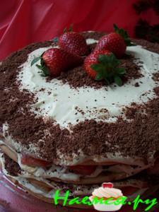 На тарелочку положить бисквитный корж, вокруг поставить бортик. Пропитать половиной сиропа. Сверху выложит половину крема. Затем накрыть вторым коржом, пропитать корж оставшимся сиропом. Сверху выложить оставшийся крем. Разровнять(что у меня не очень хорошо получилось) Сверху посыпать толстым слоем какао. Поставить на ночь в холодильник.