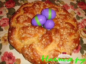 Сахар, ванил. сахар, цедру, творог, молоко и масло перемешать. Добавить взбитый белок ,перемешать. Всыпать муку с разрыхлителем, размешать. Тесто разделить на 6 кусков, каждый разделить на 3 части, из каждой сформировать 3 полоски по 30 см, сплести косичку. Выложить на противень, сформовав венец, смазать желтково- молочной смесью, обсыпать сахаром и миндалём. Выпикать 20 мин. при 200С.