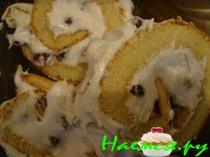 Развернуть, намазать вареньем, по центру полоской выложить шоколадно-ореховую пасту. Плотно свернуть в рулет. Можно посыпать сахарной пудрой.