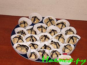 Изюм положить в посудину с оставшимся шоколадом, размешать силиконовой лопаткой и выложить кучками в бумажные корзиночки. Сверху посыпать молотыми орехами.