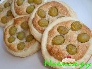 На присыпанной мукой поверхности раскатать тесто в прямоугольник.Разрезать пласт теста на несколько квадратов со стороной 12 см. По двум противоположным сторонам каждого квадрата сделать поперечные надрезы шириной 1,5 см.и длиной 4 см.В центр положить 1,5-2 ст.л. виноградной начинки.