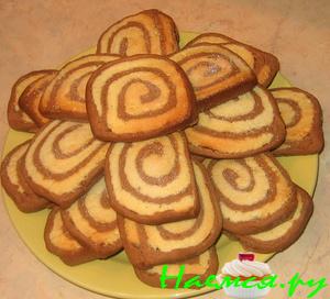 Печенье получается вкусное, с ярко выраженный ванильно-шоколадным ароматом. Очень хорошо держит форму, при запекании не раскручивается. В принципе чтоб дело двигалось быстрее можно просто раскатать два вида теста в пласт, положить друг на друга, свернуть рулетом и порезать ножом на порции.