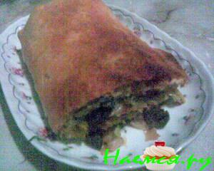 Тонко раскатываем тесто, выкладываем начинку, сворачиваем в вертуту.
