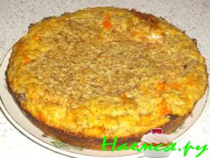 Духовку разогреваем до 200-220 градусов (точно не скажу, у меня очень своенравная газовая духовка, и напор газа все время меняется), ставим туда наш пирог и выпекаем до готовности. Готовность определяем по цвету и спичкой. Мне казалось, что печь нужно минут 50-60, но получилось 70. Повторяю, тут нужно ориентироваться на свою духовку.