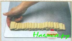 8. Сбрызните каждый прямоугольник растопленным маслом и сложите так, чтобы нижняя часть выдавалась на 1 см дальше верхней.