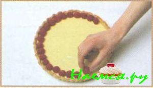 6. Равномерно распределите крем по коржу и уложите наверх ягоды. Нагрейте в кастрюле желе и апельсиновый сок и сбрызните пирог сверху получившейся глазурью.