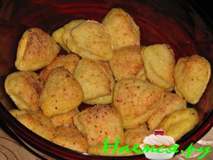 смешать муку и пекарный порошок и добавить к яйцам творогу и сахару, замесит тесто.