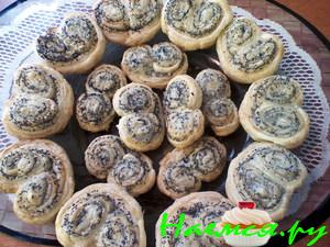 Другую половину разделить на полосочки. Посыпать маком и завернуть рулетом. Другие полосочки обсыпать сахаром и завернуть винтом.