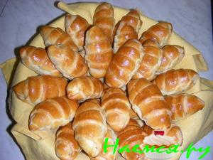 Противень смазать растительным маслом,выложить рогалички.Совет.Делайте расстояние между рогаликами побольше,они очень сильно подрастают при приготовлении.