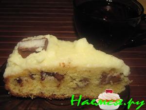 В смазанную маслом форму выложить 1/3 теста,затем выложить половину конфет,на них 1/3 теста,сверху оставшиеся конфеты,а потом последнюю часть теста.