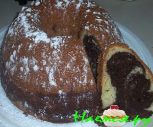 Вилкой аккуратно провести один раз по кругу, смешивая разные слои теста, - таким образом получится мраморный рисунок.