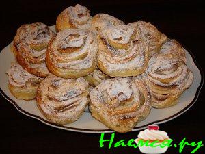 Из теста раскатайте две пышки прямоугольной формы, смажте кремом и сверните рулеты.