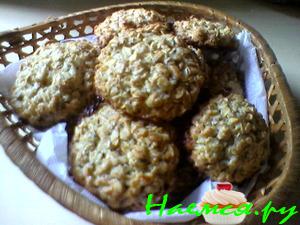 Сливочное масло взбить с сахаром, добавить желтки, мёд и коньяк. Снова взбить. Добавить просеянную муку с разрыхлителем и овсяные хлопья. Перемешать. Добавить вишню и изюм, снова перемешать. Убрать в холодильник на 20 минут. Противень сбрызнуть водой и застелить пергаментом. Скатать из теста 30-35 шариков и слегка приплюснуть. Печь при 190 градусах 10-12 минут.