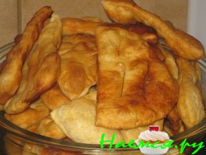 Отрезаем от теста порционный кусок и раскатываем в пласт толщиной примерно 5 мм. Режем на прямоугольники произвольной величины (у меня 10х5 см). В середине каждого прямоугольника делаем разрез. Затем, край получившейся лепёшки просовываем в разрез и вытягиваем.