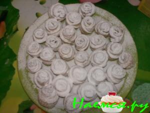Середину кружков смазать белком,затем сложить кружки от большего к меньшему.Придавить середину так,чтобы все кружки хорошо склеились.Смахнуть с роз излишки муки и обжарить каждую во фритюре до золотистого цвета.