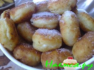 Замесить тесто. Оно будет немного жидковатым. Можно выкладывать в масло ложечкой или лепить шарики мокрыми руками. В конце посыпать сахарной пудрой.
