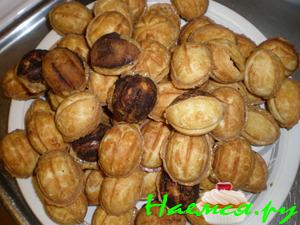 Выпекаются орешки в специальной форме "орешница". После выпечки орешков нужно их наполнить варёной сгущёнкой с дроблёными орехами.