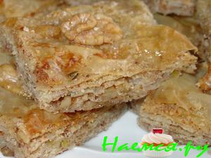 Готовую сладость равномерно полить остывшим сиропом и когда охладится, разрезать на кусочки.