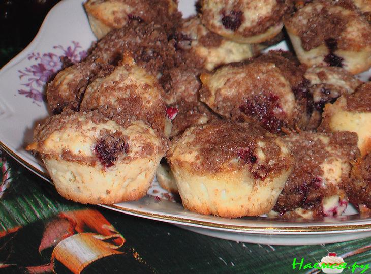 Быстро выкладываем тесто в формочки (на 3/4 формы), посыпаем штрейзелом и ставим в духовку.