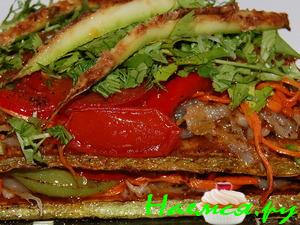 Кабачок порезать на две части. Каждую нарезать вдоль, посолить.Промакнуть и обжарить в сковороде, на растительном масле с двух сторон.