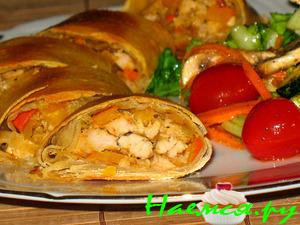 Свернуть всё в рулет,положить его на противень,застеленный бумагой для выпечки